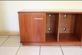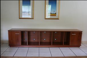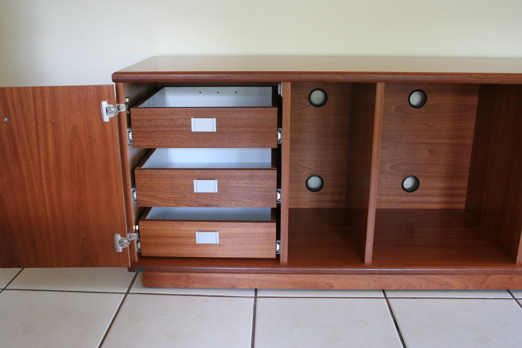 Its build out of Crown Mahogany with drawers behind doors giving it a very clean look. The whole cabinet rests on 8 castors making it easy to get behind the cabinet to sort out wiring.